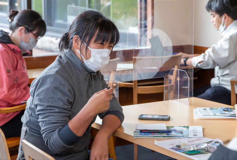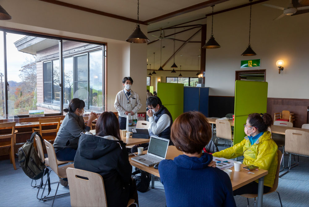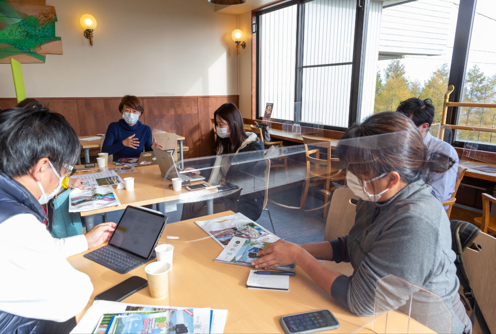 今回のツアーを振り返って、グランデコリゾートのロープウェイ山頂レストラン「BunaBuna」にて意見交換会を開きました。