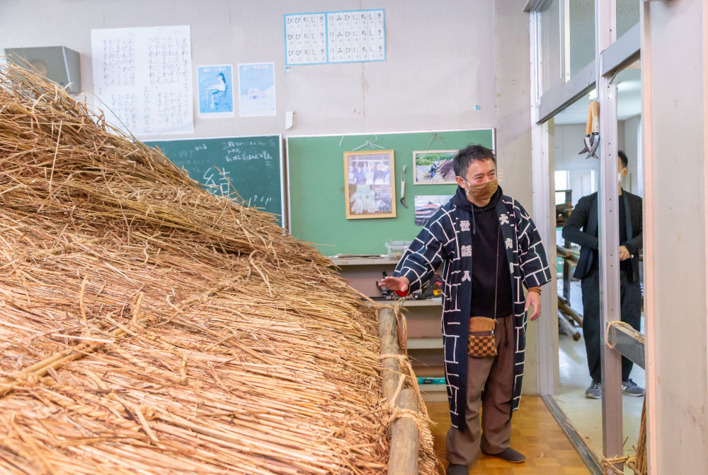旧小学校校舎を会場に、茅葺き体験をさせてもらいました。近場で採れる茅を材料に、手作業で葺いていきます。
