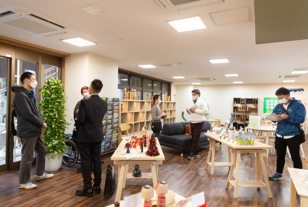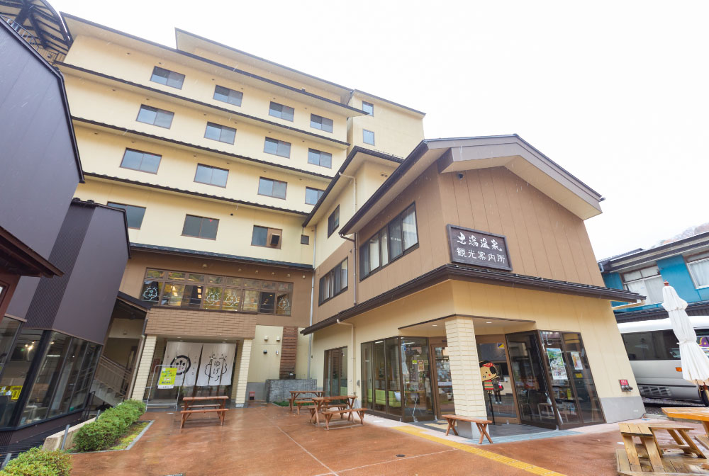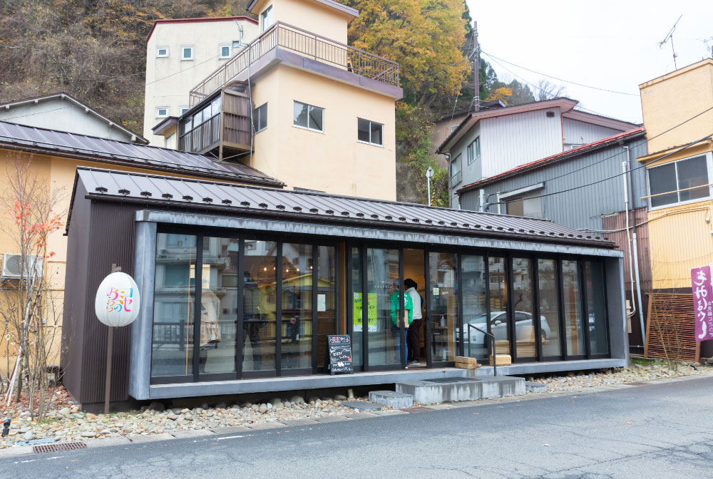 土湯温泉街の中心部にある複合施設「湯楽座(ゆらくざ)」は2021年4月にグランドオープンしました。1階には観光案内所のほか、土湯こけしや地場産品の展示販売コーナーがあり、2階にはカフェレストランやWi-fiが完備されたコワーキングスペースが、さらに、5・6階には素泊まりできる宿泊室も整備されています。