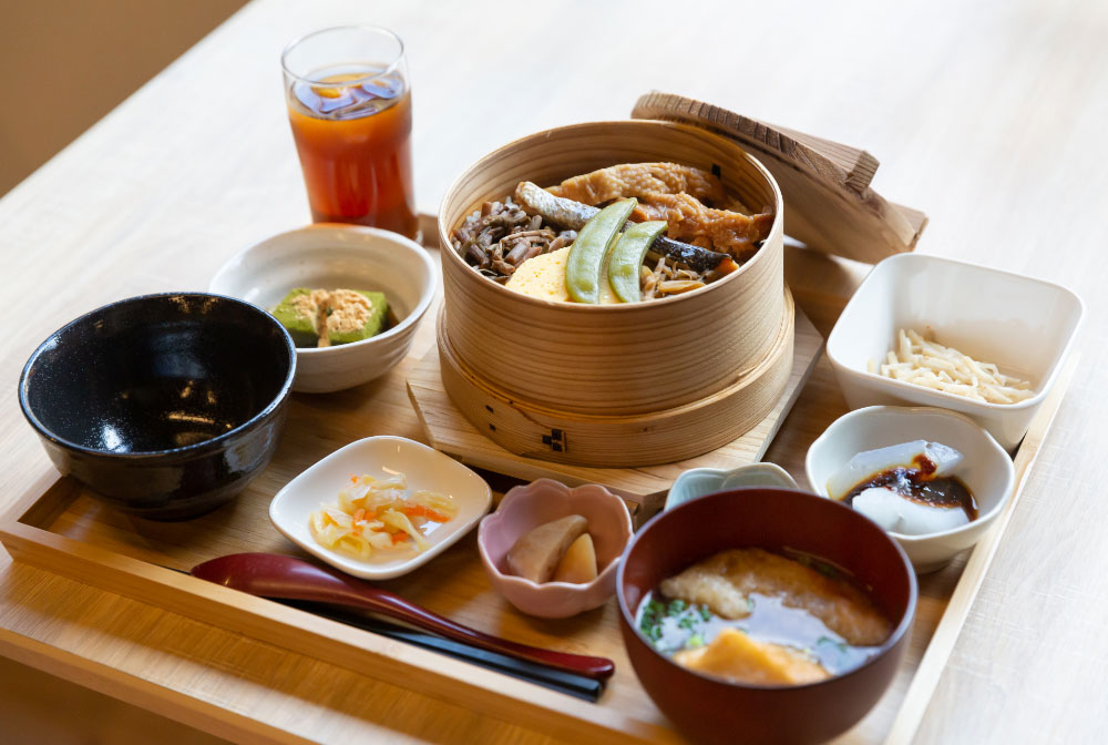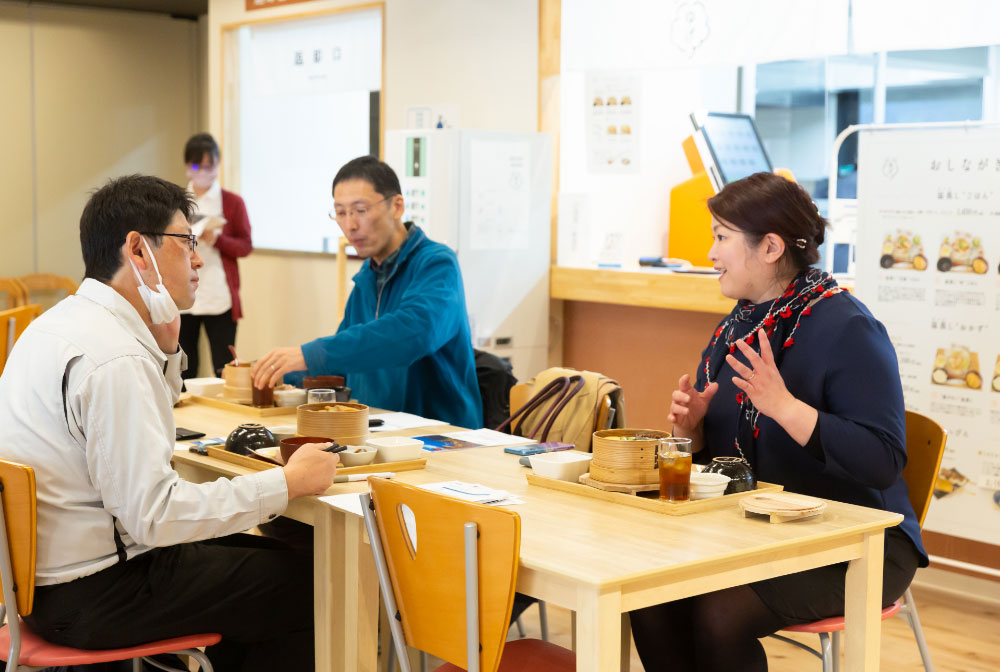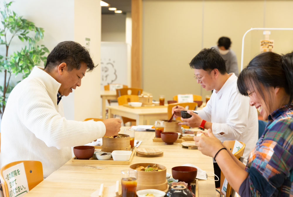 オリエンテーション後には、2階のカフェレストラン「温蒸し食堂ゆげ」で、隣接するどぶろく醸造所の糀を使ったわっぱめし「温蒸しごはん」をいただきました。手作りこんにゃくや山菜など、地元の幸もたっぷりと味わえます。