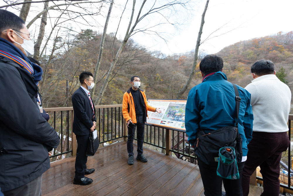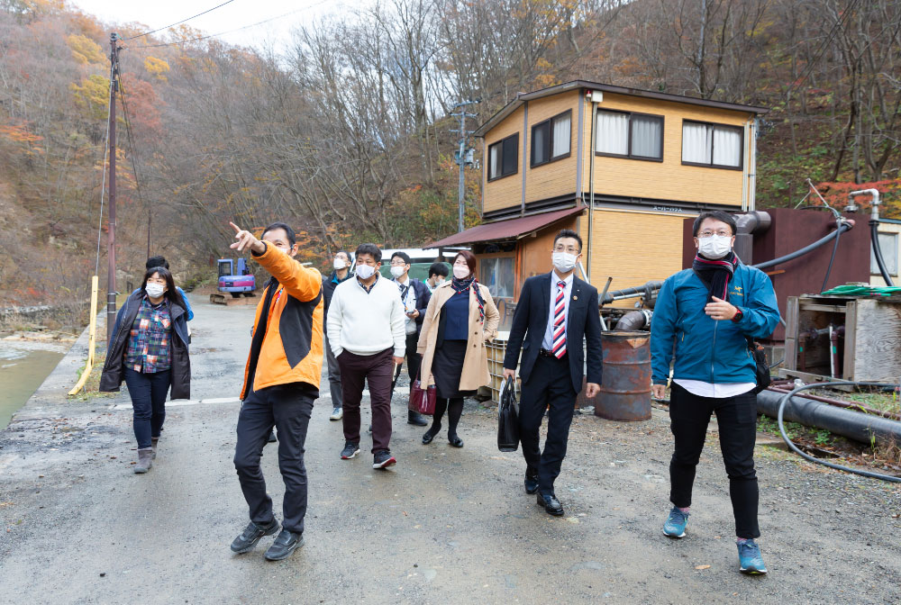 震災による建物への直接的な被害に加え、風評被害などから休廃業する旅館やホテルが相次いだ土湯温泉。この危機的状況からまちの復興と振興を目指し、平成24年10月に株式会社元気アップつちゆが設立されました。町内を流れる東鴉川(ひがしからすがわ)を利用した小水力発電事業と、温泉を利用した地熱バイナリー発電事業を復興の柱として、再生可能エネルギーを通した新しいまちづくり事業を展開しています。参加者は土湯温泉バイナリー発電施設を見学し、「元気アップつちゆ」の佐久間さんからバイタリティあふれる起業秘話を伺いました。「知識も技術もゼロからのスタートだった」と当時を振り返ります。