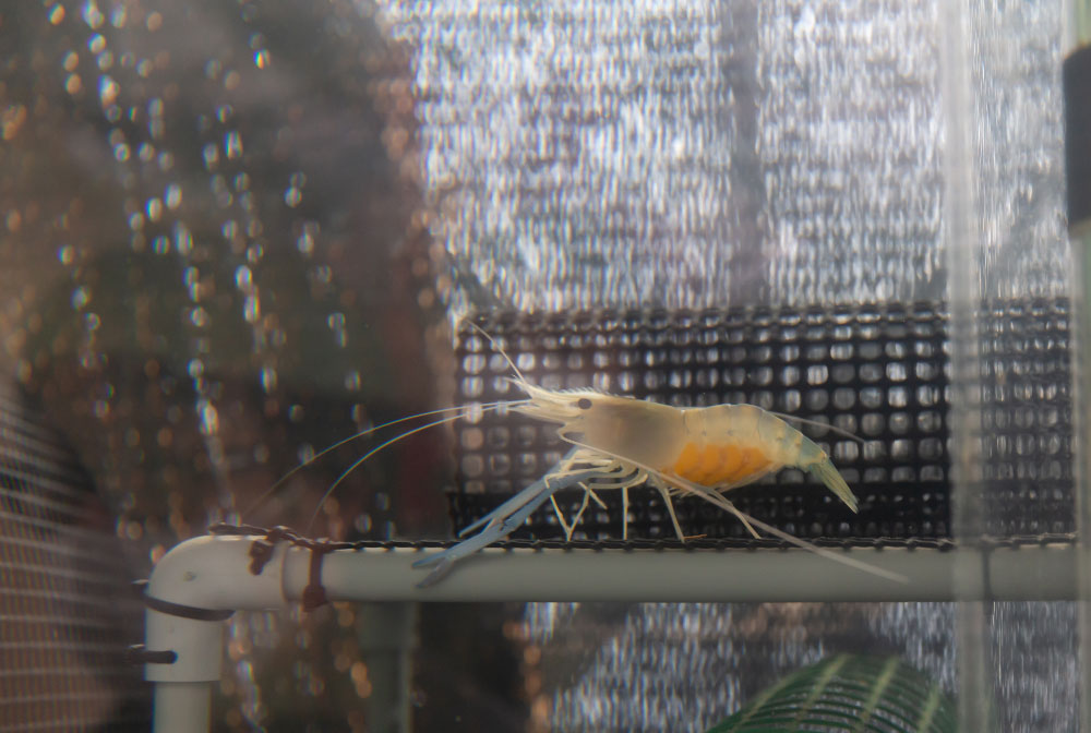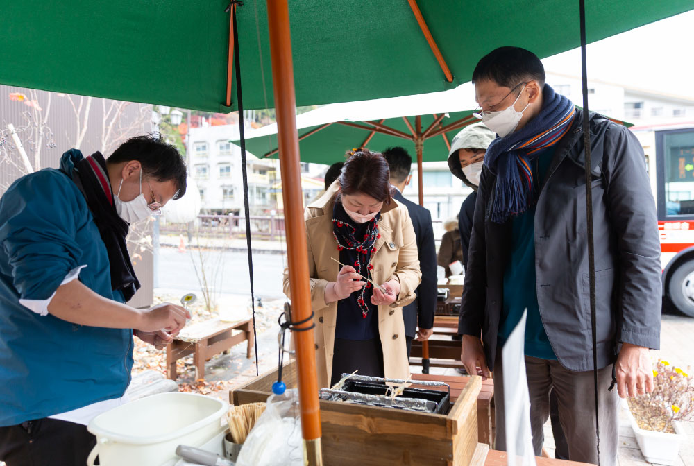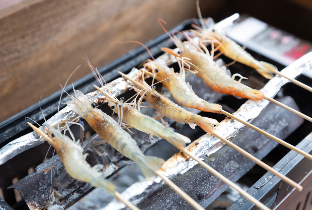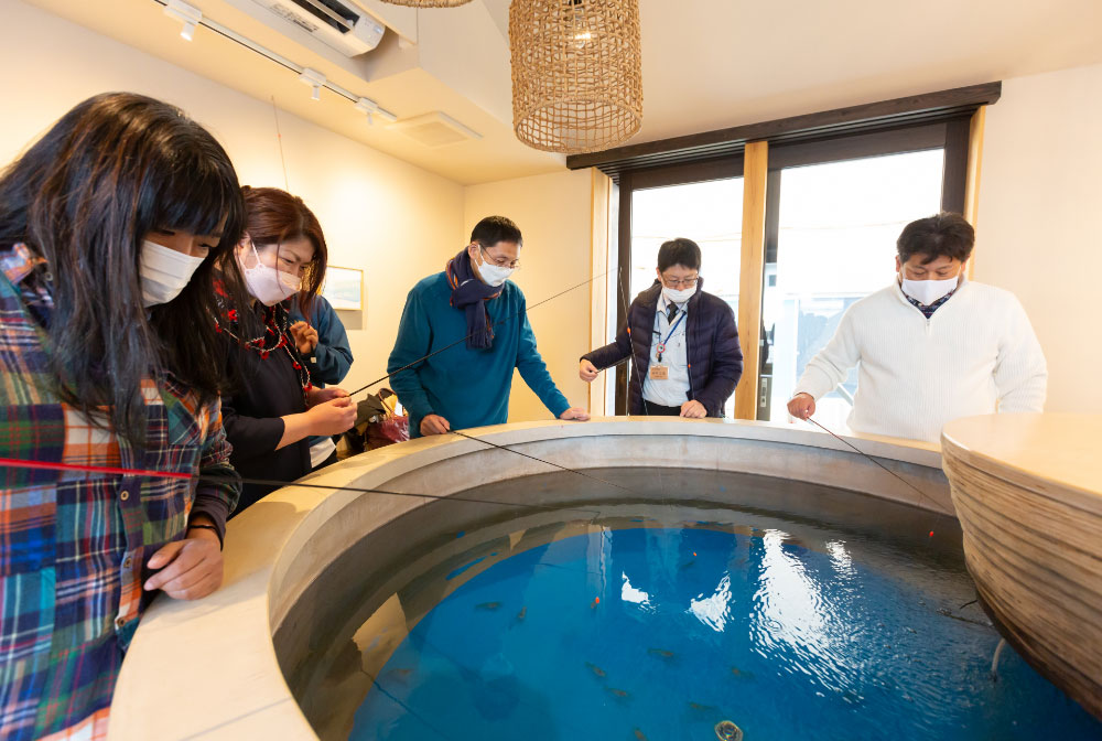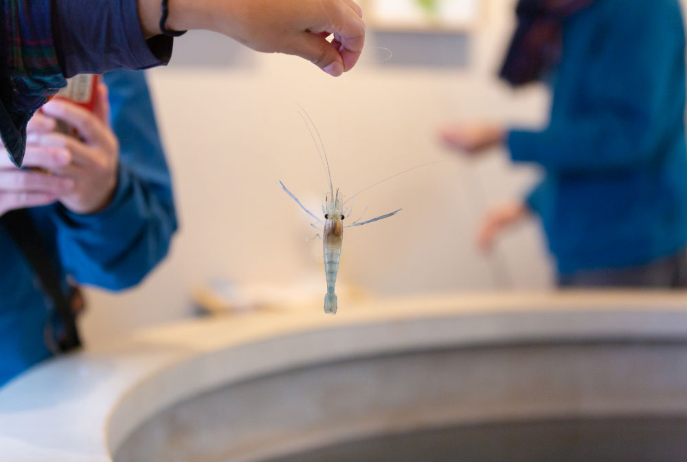 その後、温泉街に戻りコミュニティカフェ「おららのコミセ」へ。ここでは、バイナリー発電で生じる温排水を利用して養殖したオニテナガエビの釣り体験が楽しめます。釣ったエビはその場で素焼きにして、美味しくいただきました。