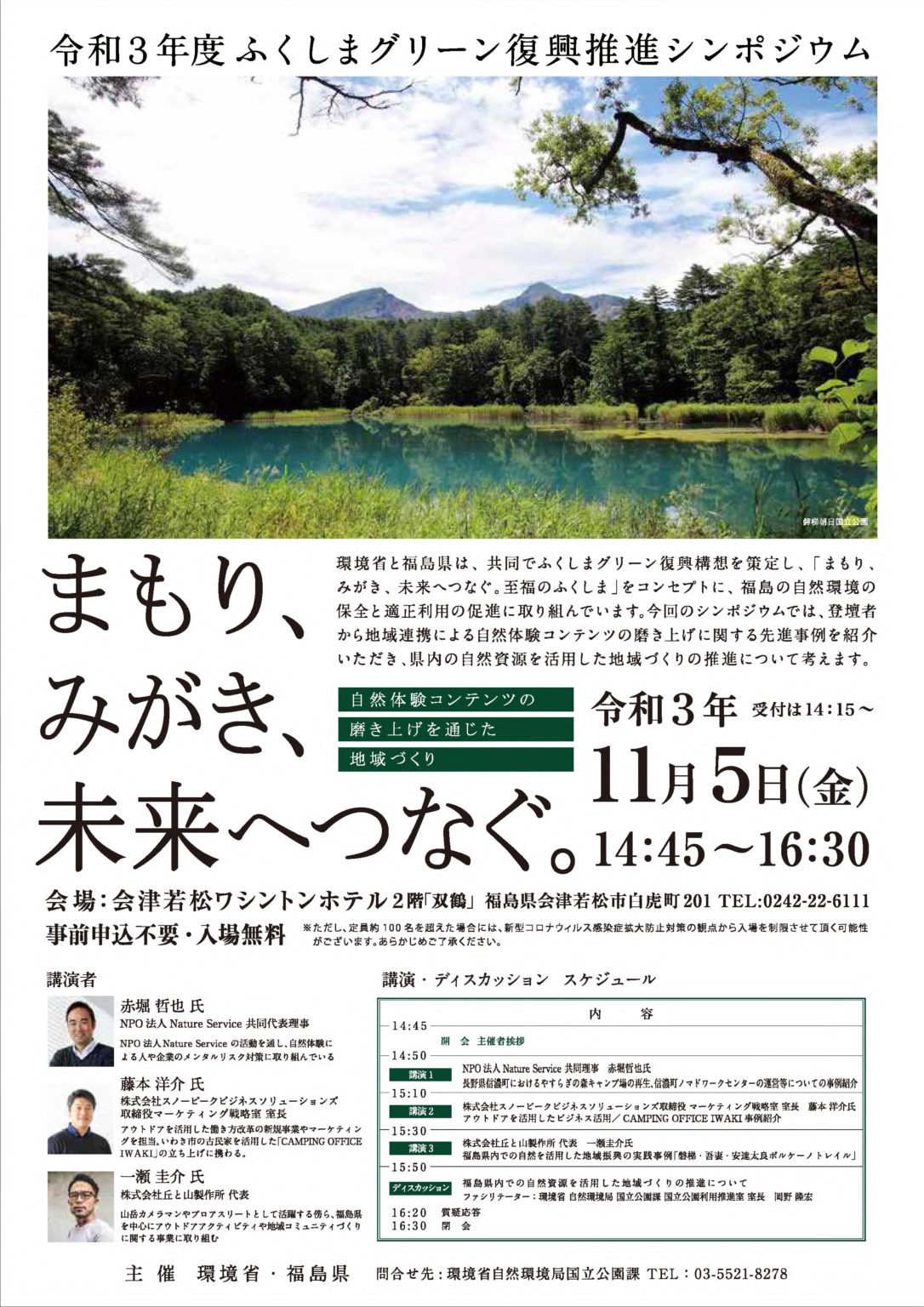 環境省と福島県は、「まもり、みがき、未来へつなぐ。至福のふくしま」をコンセプトに、地域の皆様と連携してふくしまの自然の保全と適正な利用の促進に取り組んでいます。