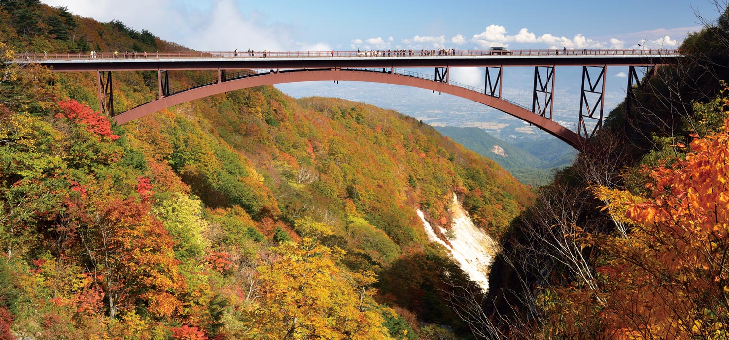 磐梯吾妻スカイラインの展望ポイントである吾妻八景のひとつ。つばくろ谷にかかる不動沢橋からは遠くに福島市街地を望み、橋の下に広がる大迫力の景色は見応え満点です。特におすすめの季節は谷全体が色づく紅葉の頃。「つばくろ谷」は、かつてイワツバメが飛び交っていたことから作家の井上靖氏によって名付けられました。