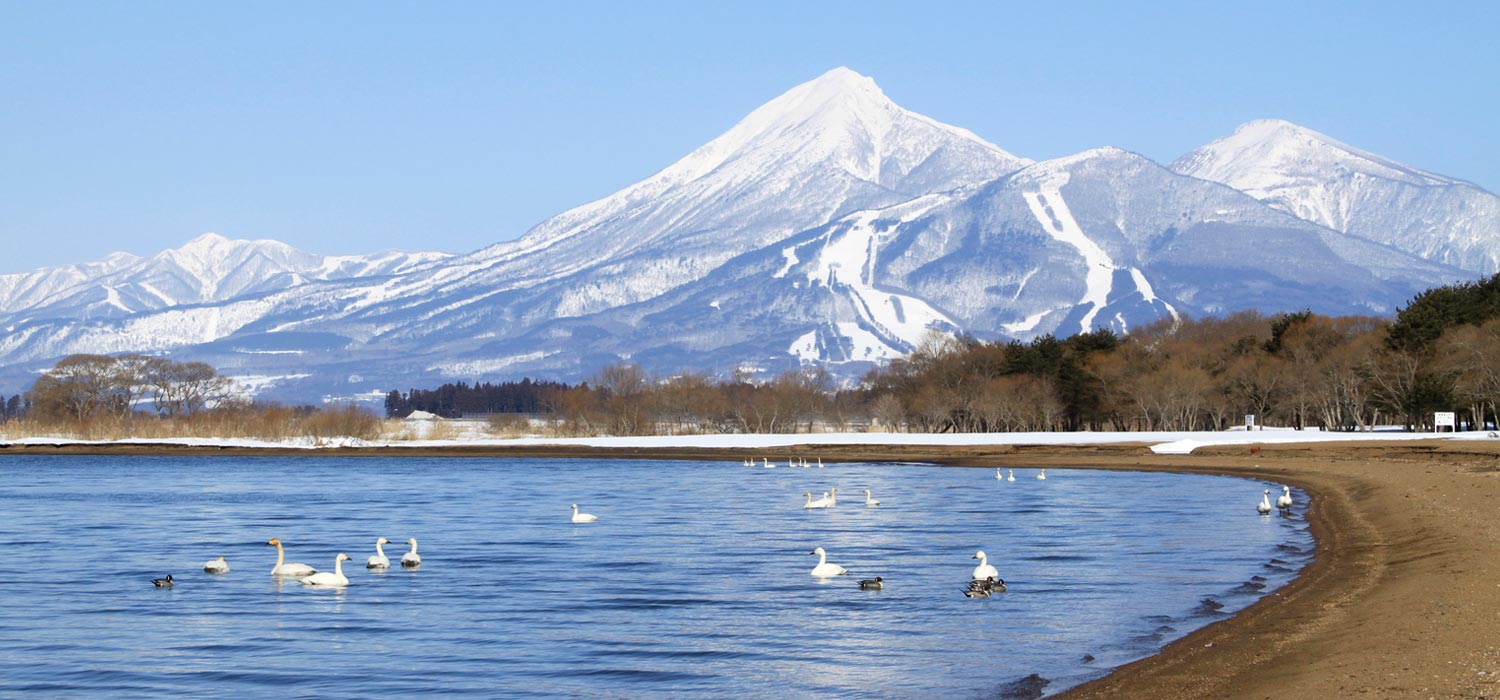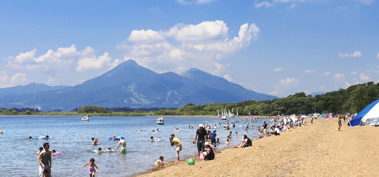 猪苗代湖の北東に位置し、国道49号線沿いに続く白い砂浜と松林。夏の志田浜は磐梯山を望む絶景の湖水浴場として賑わいます。また、毎年10月から4月には3,000羽以上の白鳥が飛来し、猪苗代湖の冬の風物詩として人気のスポットとなります。湖の向こうの山々に沈む夕陽の眺めも美しく、四季折々の表情が楽しめます。