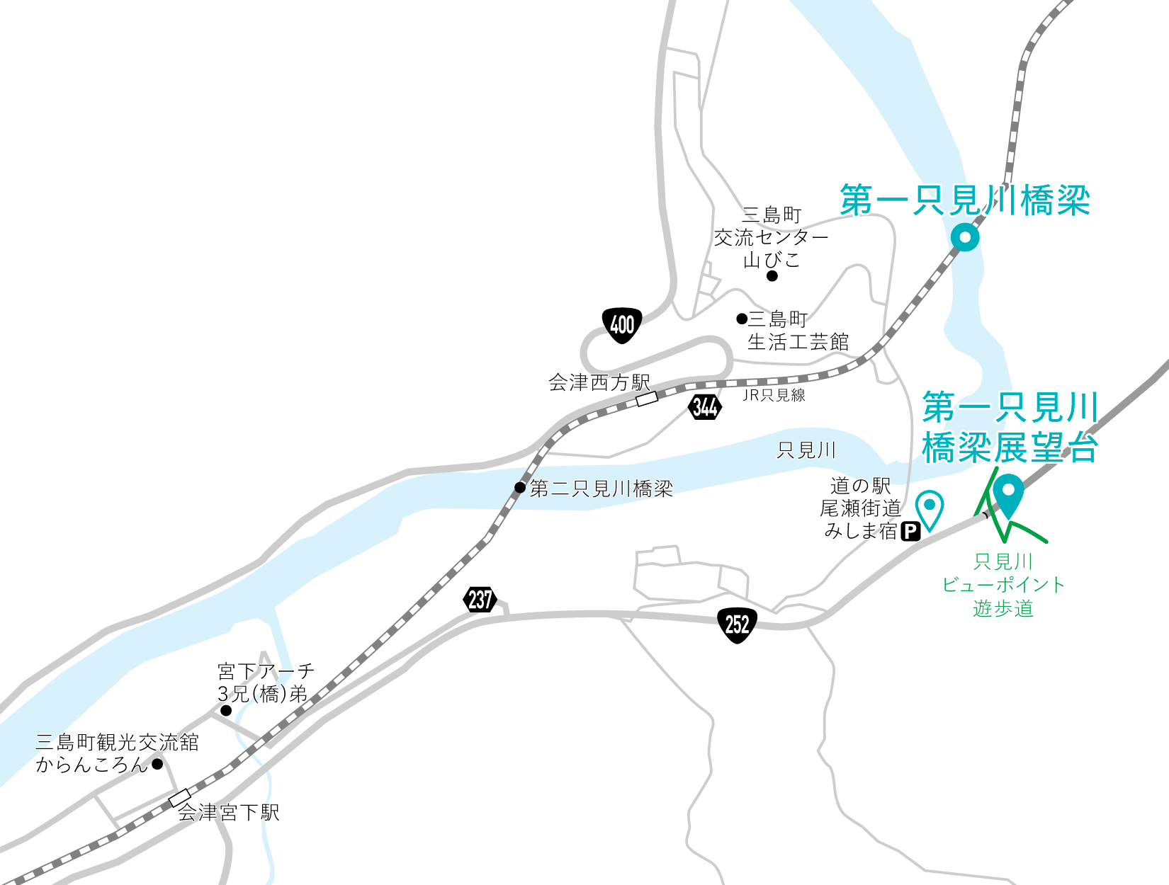 | 住所 | ①第一只見川橋梁:第一只見川橋梁展望台(福島県大沼郡三島町大字川井)②第二只見川橋梁:会津西方駅より国道400号を会津宮下方面に400mの場所(福島県大沼郡三島町大字大登)③第三只見川橋梁:国道252号高清水スノーシェッド内(福島県大沼郡三島町) |