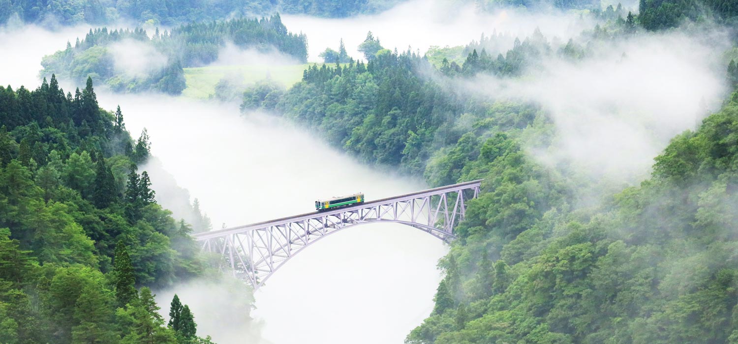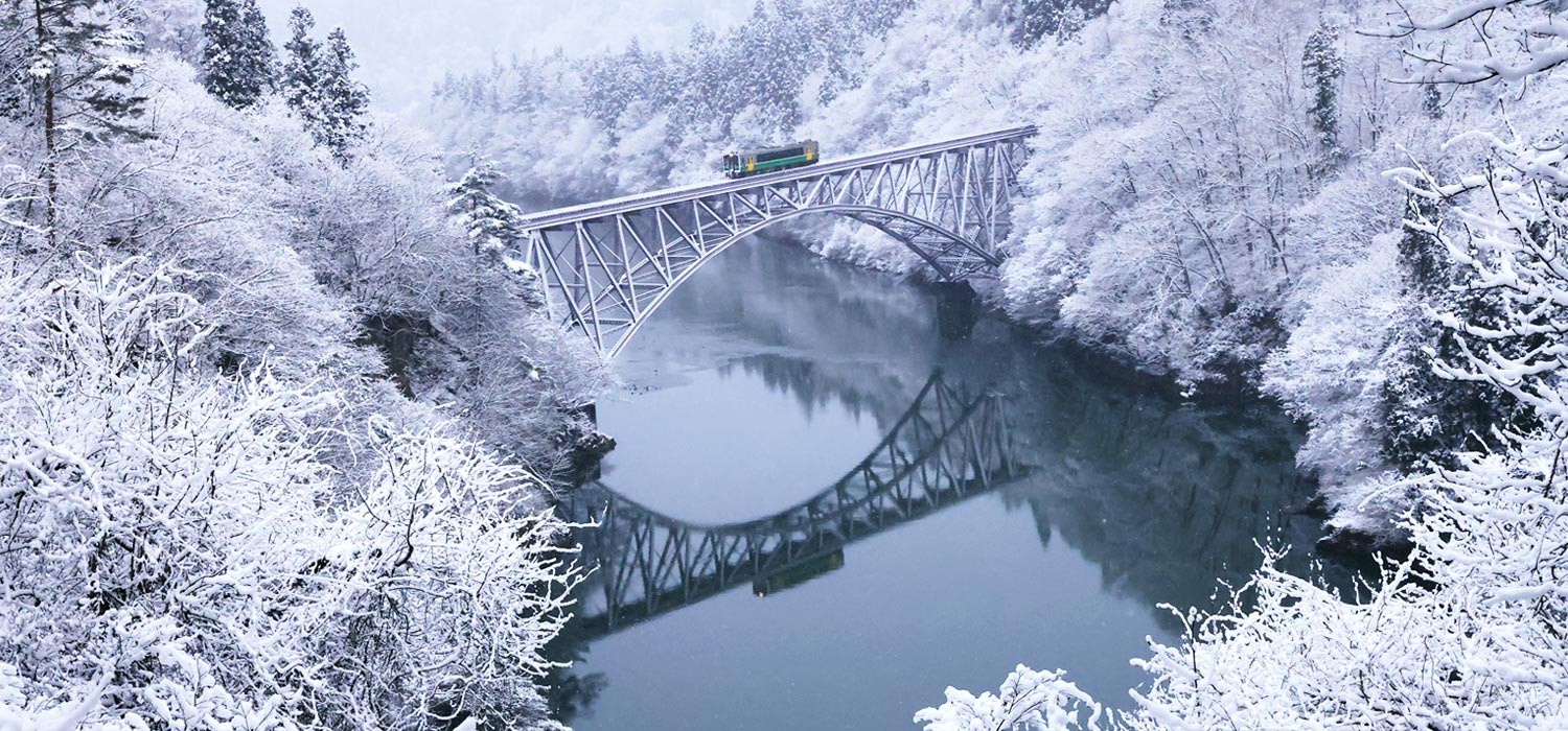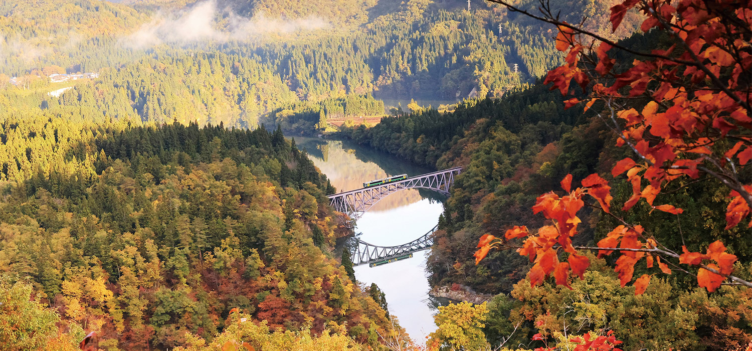 JR只見線が通る鉄橋の中で最も人気が高いのがアーチ型鉄橋「第一只見川橋梁」。過去には「紅葉の美しい鉄道路線ベストテン」第1位、「雪景色のきれいなローカル線ベストテン」第3位にも選ばれるなど、国内外で人気を博しています。「道の駅尾瀬街道みしま宿」の側に整備された展望台から眺める奥会津の景観は、季節や時間によってダイナミックに変化し、いつ訪れても見応え十分です。さらに車で約10分ほどのビューポイントからは第二只見川橋梁を、そこからさらに車で約10分ほどのポイントでは第三只見川橋梁を望むことができます。カメラマンや観光客で賑わう列車通過時刻や観光シーズンを外して、ゆっくりと楽しむのもおすすめです。