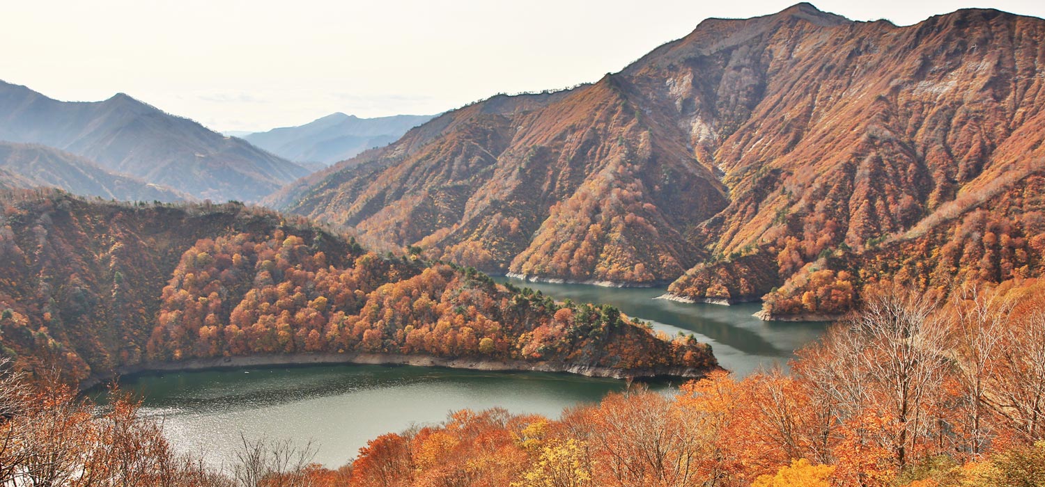 只見町と新潟県魚沼市を結ぶ県境のビューポイントからは、広大なブナの自然林と越後三山の雪解け水をたたえる田子倉湖、雪崩によって山肌が削られて岩が露出した雪食地形の独特な景色を望むことができます。紅葉の季節はもちろん、残雪とブナの新緑のコントラストが楽しめるゴールデンウィーク頃にも是非訪ねていただきたいスポットです。