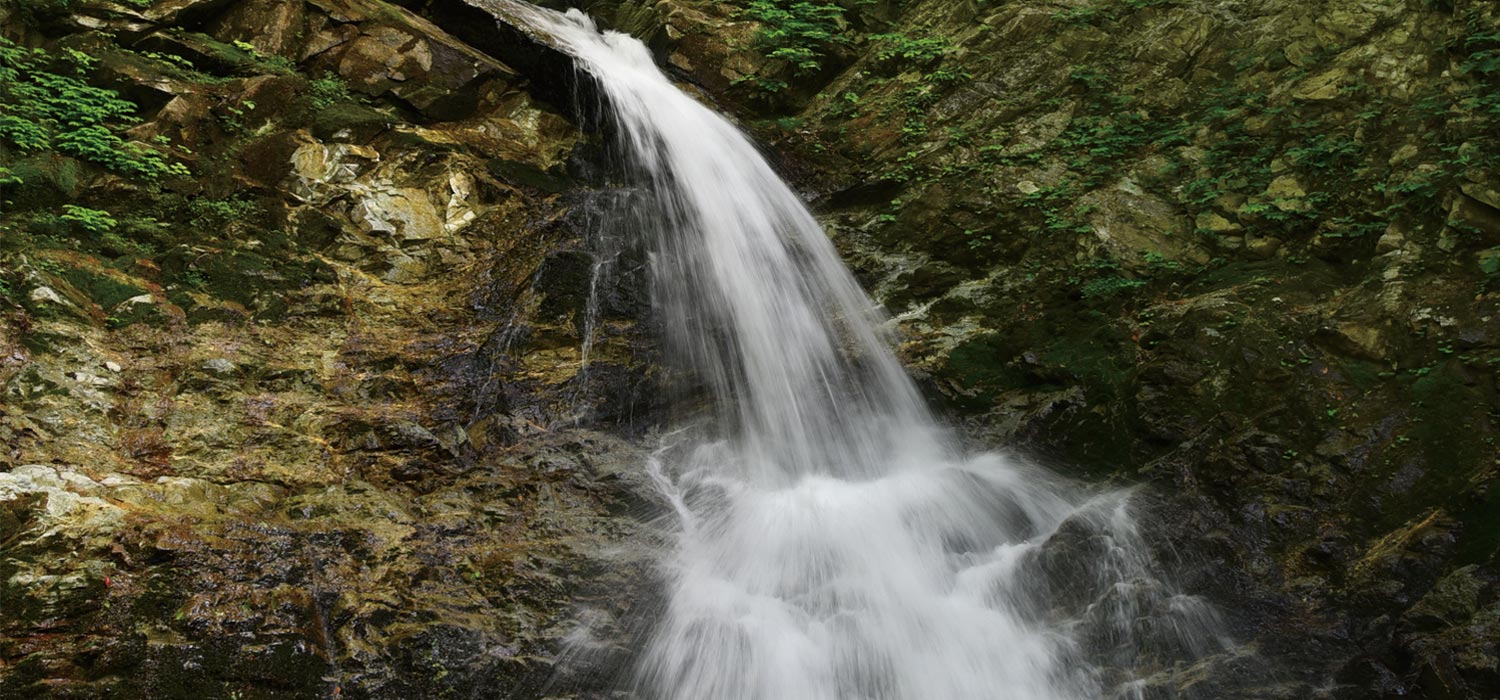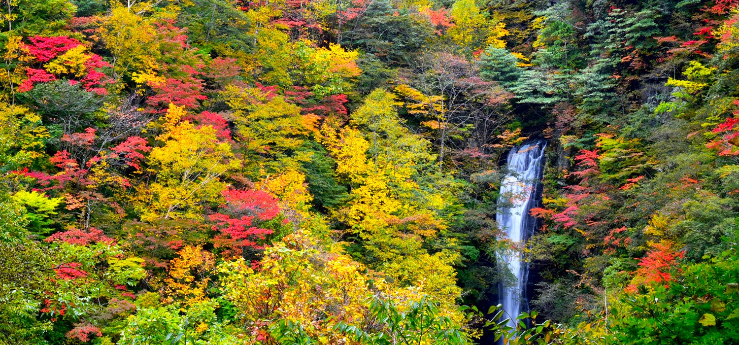 高さ40mと15mの二段になって流れ落ちる滝です。江戸初期、第二代会津藩主加藤明成が江戸から会津入りする際、川の対岸から見たこの滝に魅了され、岩に腰掛けたまま日が暮れるまで眺めていたのが名前の由来といわれています。深い森の中、水しぶきをあげながら流れる優美で精悍な姿は秘境と呼ぶにふさわしい美しさです。