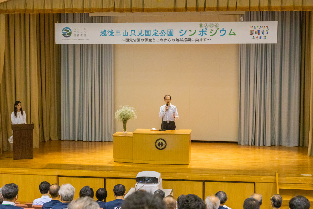 7月13日、大沼郡金山町の御神楽館を会場に、「越後三山只見国定公園編入記念シンポジウム」が開催された。当日は晴天に恵まれ、輝く夏の緑に包まれる環境の中、国や県、市町村などの関係者や一般参加者など、およそ100人が参加した。