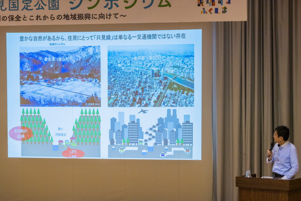 「奥会津プロジェクトチーム」の立ち上げや、「JR只見線食育弁当」の開発、金山町観光物産協会のロゴデザイン、只見町の「三石神社」の紹介冊子制作、「JR只見線ブライダルトレイン」の装飾などの活動実績を紹介。少子高齢化や地方からの人口流出が進む状況下、環境維持や地域振興には若い力が必要であると強調した。