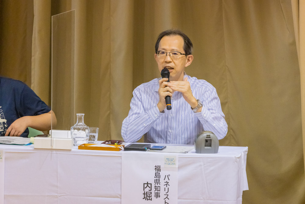 モンベルの辰野勇会長、只見線地域コーディネーターの酒井治子氏、内堀雅雄知事がパネリストとして登壇。新潟大名誉教授の崎尾均氏がコーディネーターを務め、国定公園の保全や利活用について議論した。