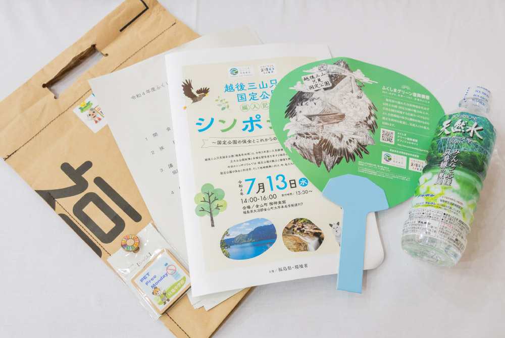 参加者には、只見中学校の生徒が作成した「エコバッグ」やブナの間伐材で作られた「SDGsバッジ」などが配布された。