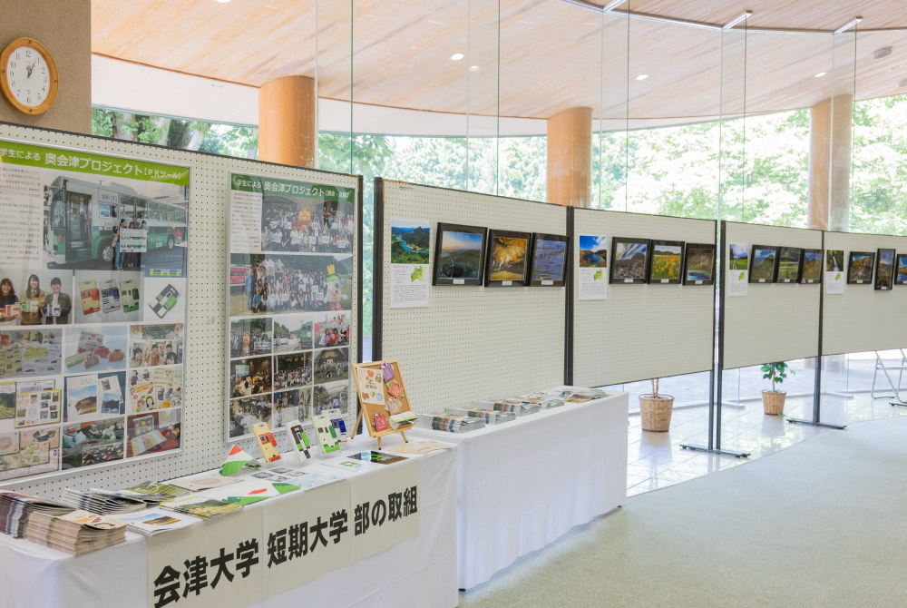 エントランスには、県内の4つの国立・国定公園を紹介する写真パネルと、会津大学短期大学部の取組を紹介するパネル等が展示された。