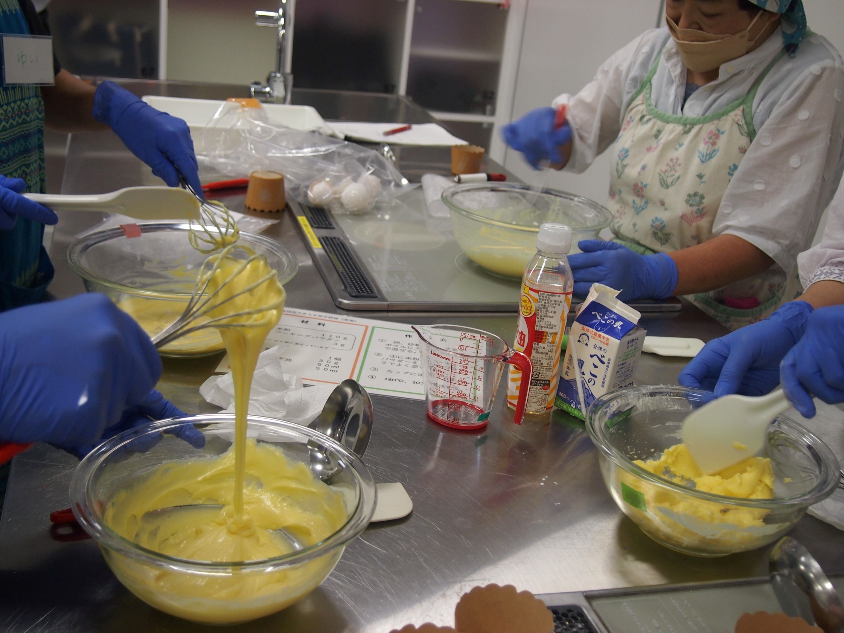 講義では米粉が注目されている背景、米粉の成分や選ぶポイントなどを説明し、実習では米粉種類の違いを体感することを目的に焼き菓子を製作しました。