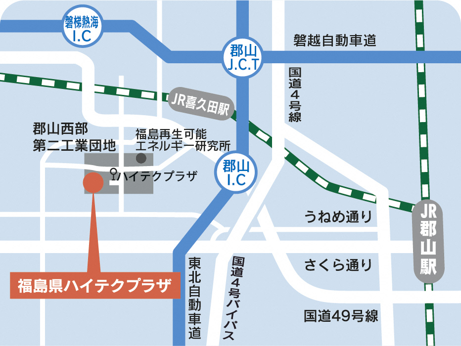- JR東日本・郡山駅西口のバス停8番乗り場から「郡山郵便局経由西部工業団地」行きに乗車、「ハイテクプラザ前」で降車(約40分、710円)、バス停のすぐ目の前