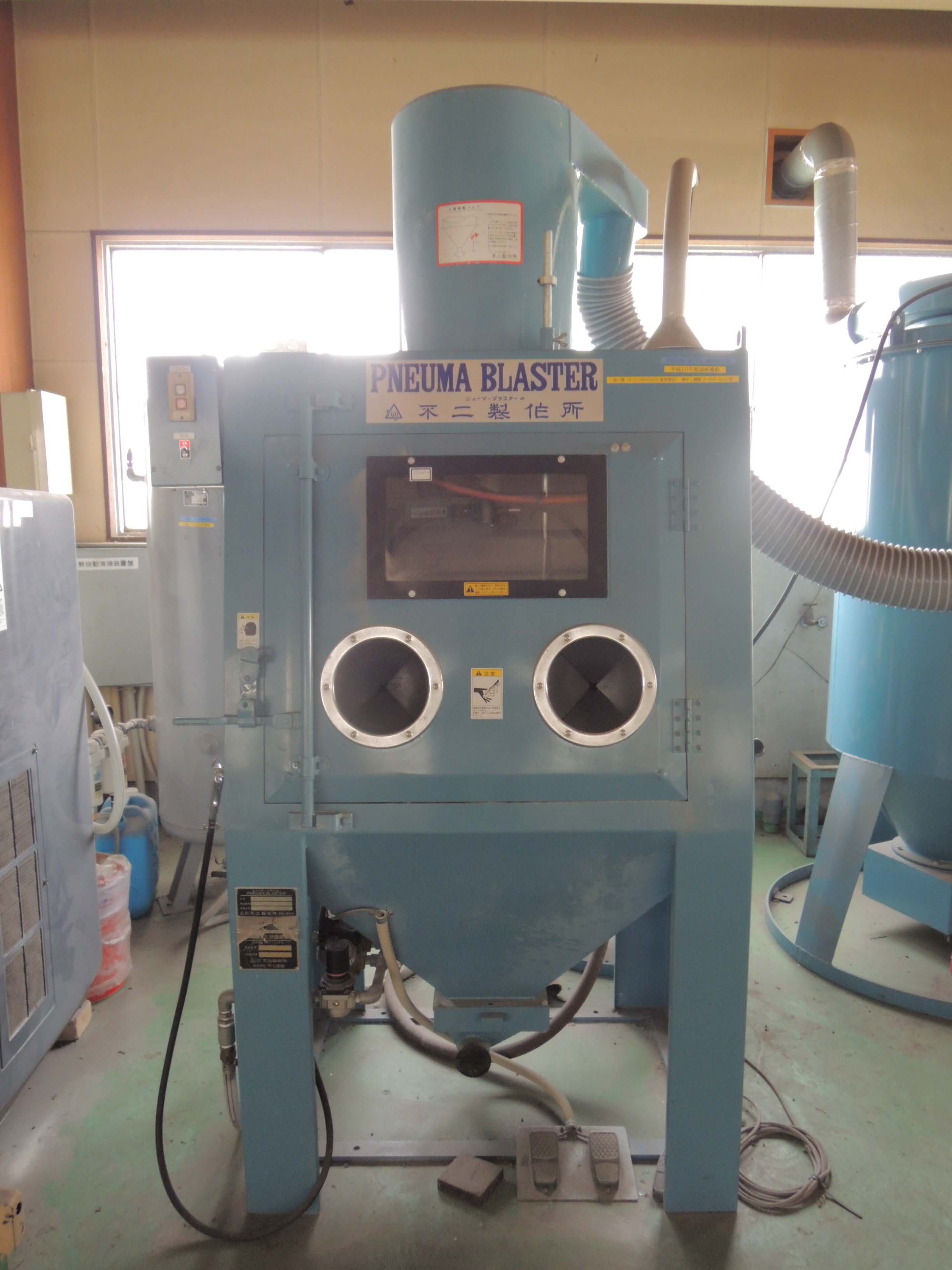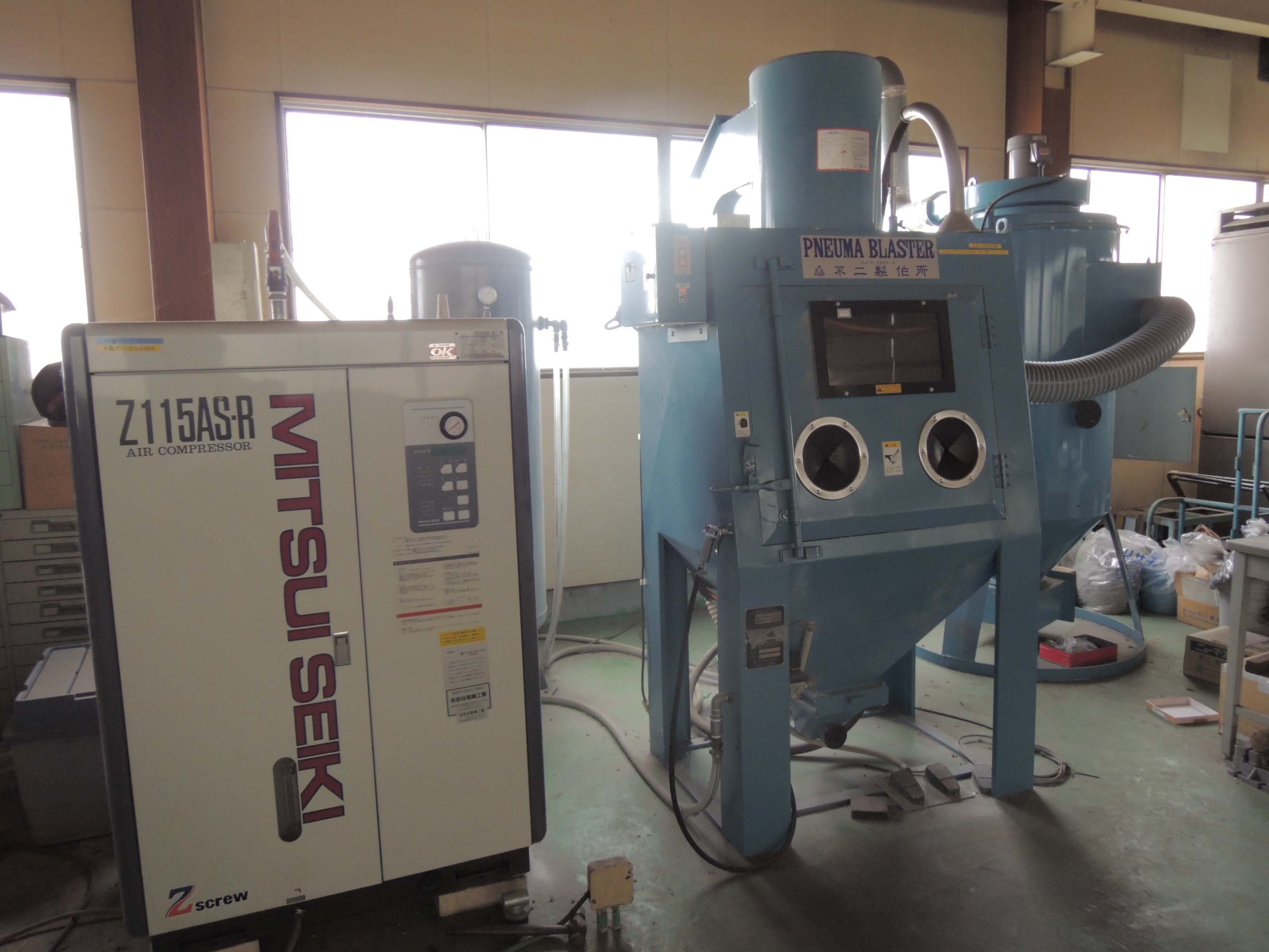 - 重力式ノズル径:直径9 mmエアノズル径:直径4 mm加圧式ノズル径:直径5 mm加工テーブル径:600 mmテーブル回転数:4 rpm〜14rpmコンプレッサ:8.5 kW投射材:鋳鋼、セラミックス等の微粒子