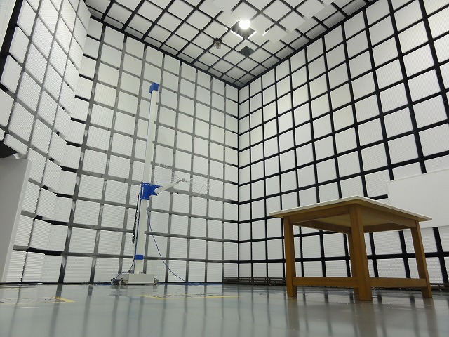- 外来電波の侵入及び室内で発生する電波の漏洩を遮断し、壁面に貼った電波吸収体により電波の反射を防ぎ、有限の室内を無限の自遊空間と同等の性質にした部屋です。