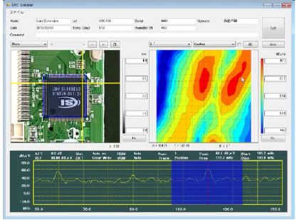 - 電子基板に沿ってプローブを自動で走査して、発生するノイズの周波数及び強度を測定し、本体カメラで撮影した位置情報と重ね合わせてマッピングすることで、電界・磁界ノイズの発生源を可視化することができます。また、本体カメラで撮影した画像だけでなく、CAD図(jpg画像)との重ね合わせも可能です。