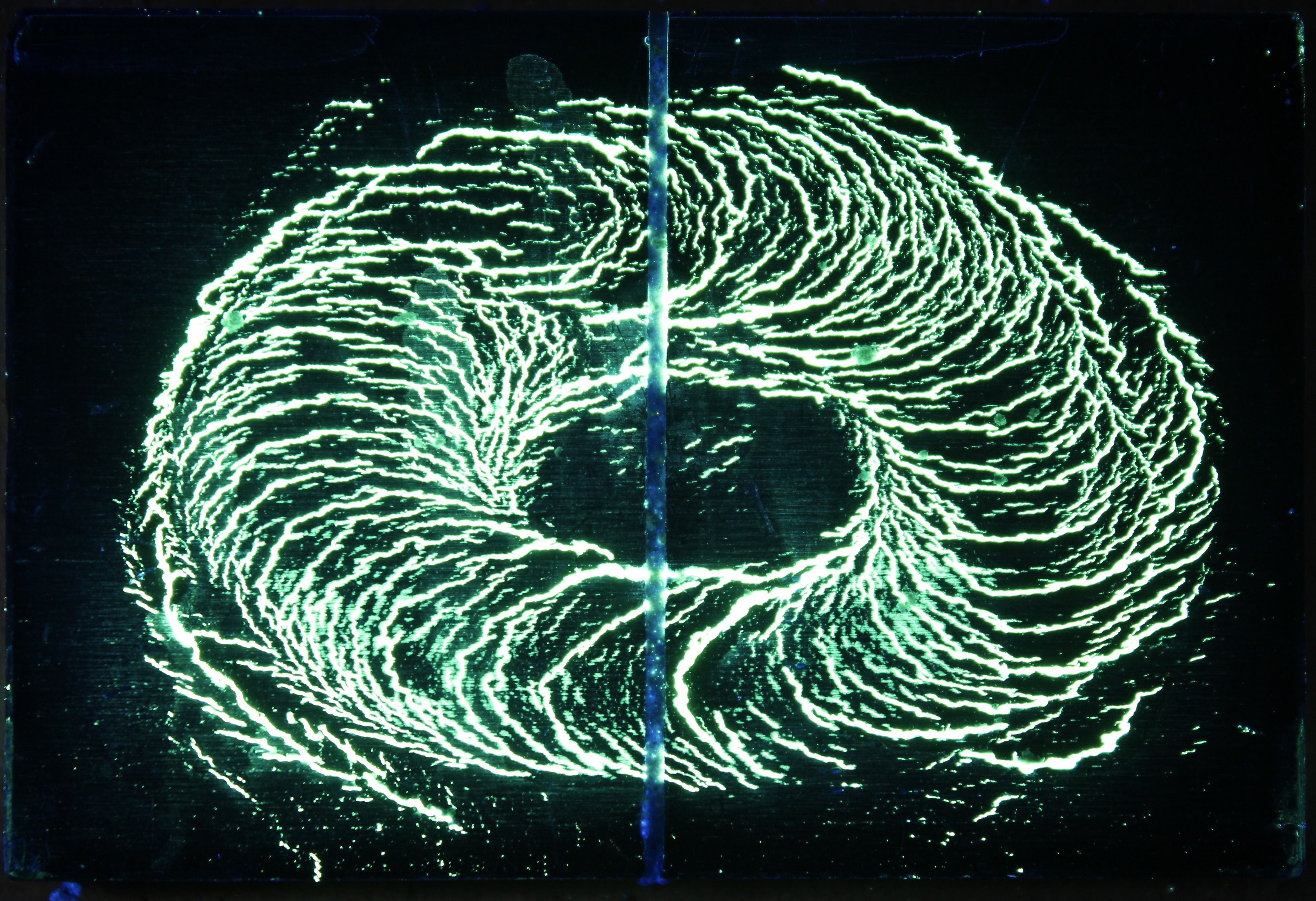 - 製品表面の傷部分に蛍光剤が残り、ブラックライトで光ることで傷を検出しやすくします。航空宇宙分野の検査に使用される装置です。