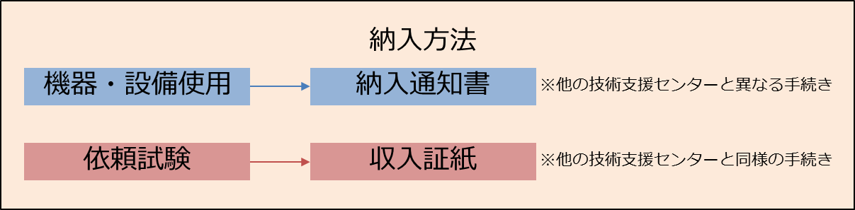 機器の予約や試験の依頼窓口は南相馬技術支援センター、そして手数料(依頼試験)の納入は収入証紙と、他と同様ですが、使用料(機器・設備使用)の納入は納入通知書により行っていただきます。