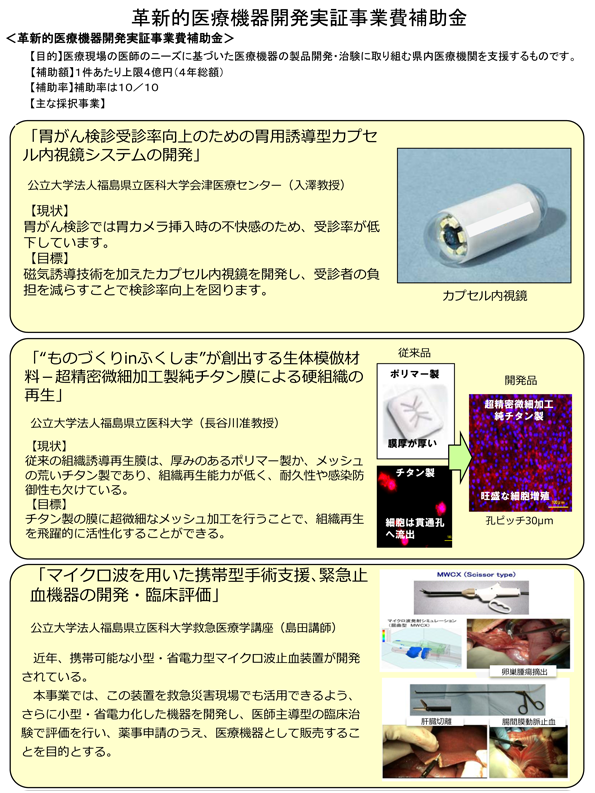 東日本大震災及び福島第一原子力発電所事故からの福島県の復興を大きな目的とし、福島県の医療福祉機器関連産業の集積を更に促進し、雇用の確保を目指すために、医療機器の製品開発・治験に取組む医療機関等を支援する制度です。(当補助金の募集は終了しております。)