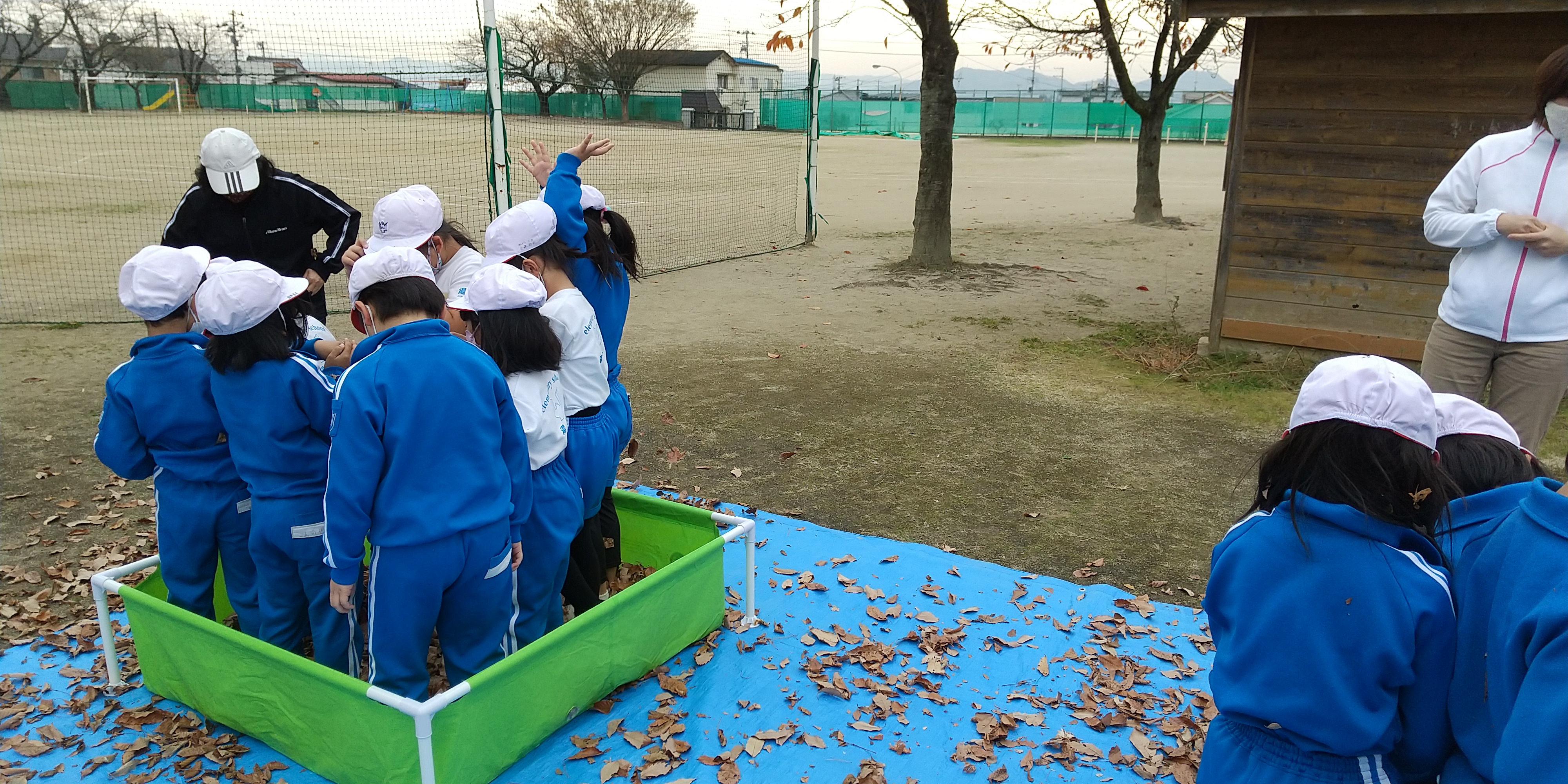 広葉樹の落ち葉を簡易プールに入れ、落ち葉の形、香りを確かめてもらいます。