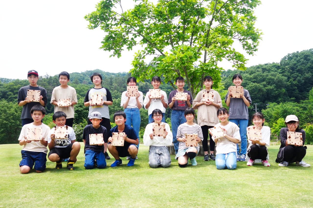 森の時計作り体験では、約20cm四方の木製の文字盤に木の実や枝をデコレーションしてオリジナルの時計を作ります。作った時計にはムーブメントと針を取りつけ、実際に時計として使用できます。