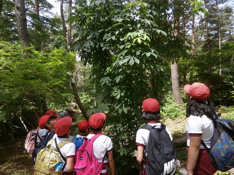 広い森の中でたくさんの種類の木や植物を観察することができた。 雨の日の活動となったが、落ち葉がクッションのようになっていること、落ち葉(腐葉土)を通った水が、豊かな養分を含み、わき出て小川となっていることを実際に観察することができた。また、樹木オリエンテーリングもでき、よかった。