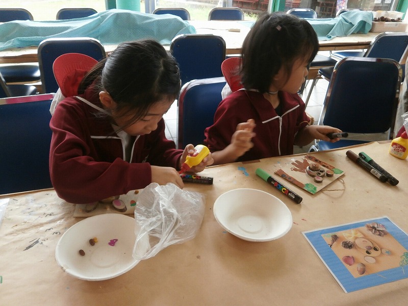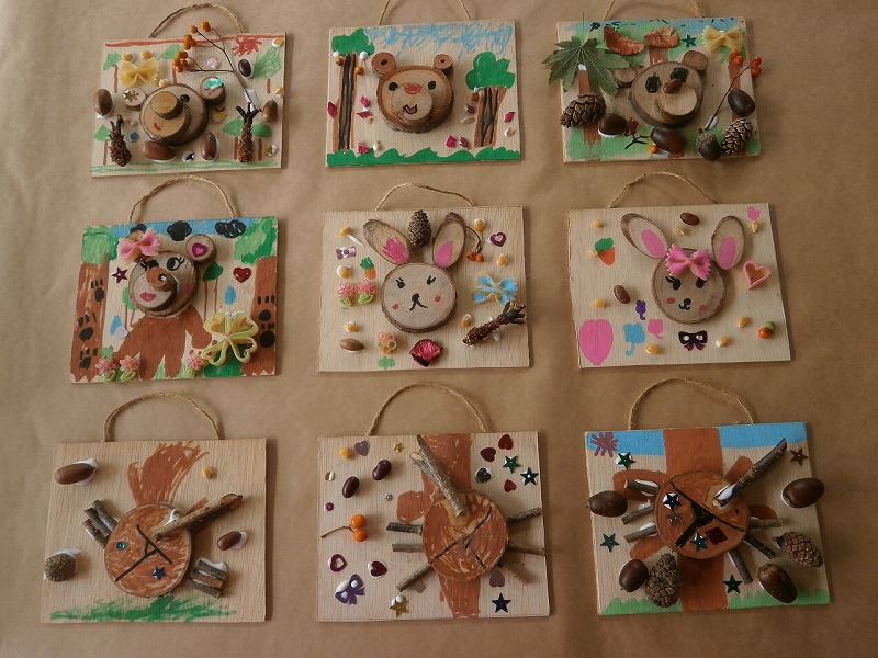 秋の自然に親しみ、木の実や葉などを使って、楽しく製作活動をすることができた。