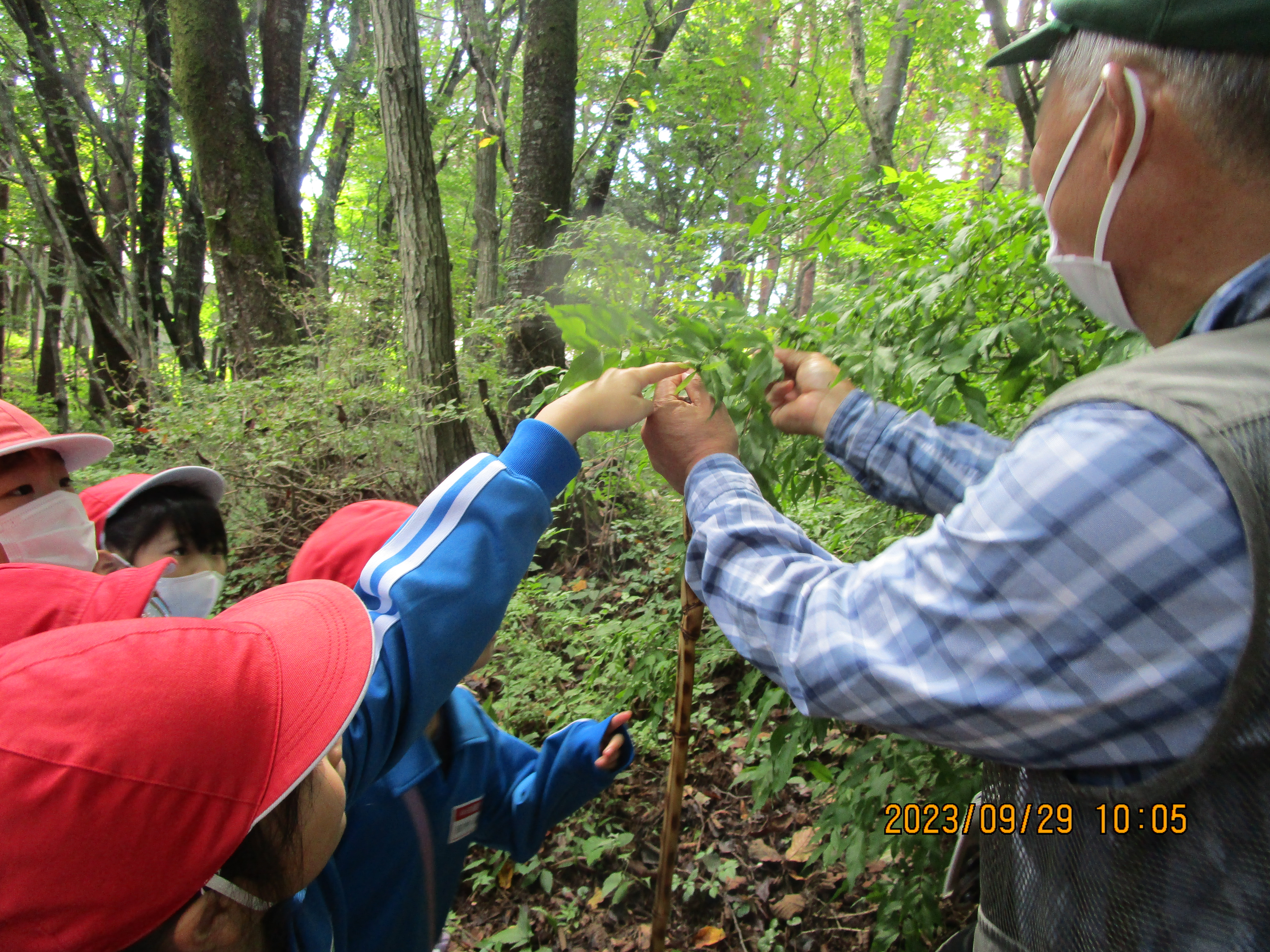 もりの案内人の方が植物のことを詳しく教えてくださり、子どもたちも五感を使って学習することができた。