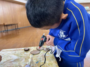 本校では、木工工作を体験させていただきました。さまざまな材料が準備され、そこからイメージをを広げながら子どもたちも楽しんで「森のいきものたち」を作ることができました。 材料や道具の扱いについても丁寧な説明があり、のこぎりやグルーガンなどの扱いなど、学校での学習にも生かすことができました。 自然の中で普段体験できないような楽しいミッションがたくさんあり、子どもたちも協力しながら楽しむことができました。