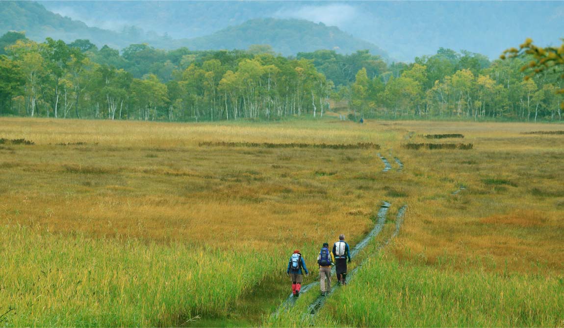 This route will take visitors around the foot of Mt. Hiuchi where the Tashiro marsh and the forest zone repeat, and to other scenic spots of Fukushima Oze, including Sanjo Falls, Ozegahara Marsh, and Lake Ozenuma. You can stay overnight at either the Onsen hot spring area or the Miharashi area. The following day, visitors will pass Lake Ozenuma and return to Miike by bus from Numayama-toge Pass.