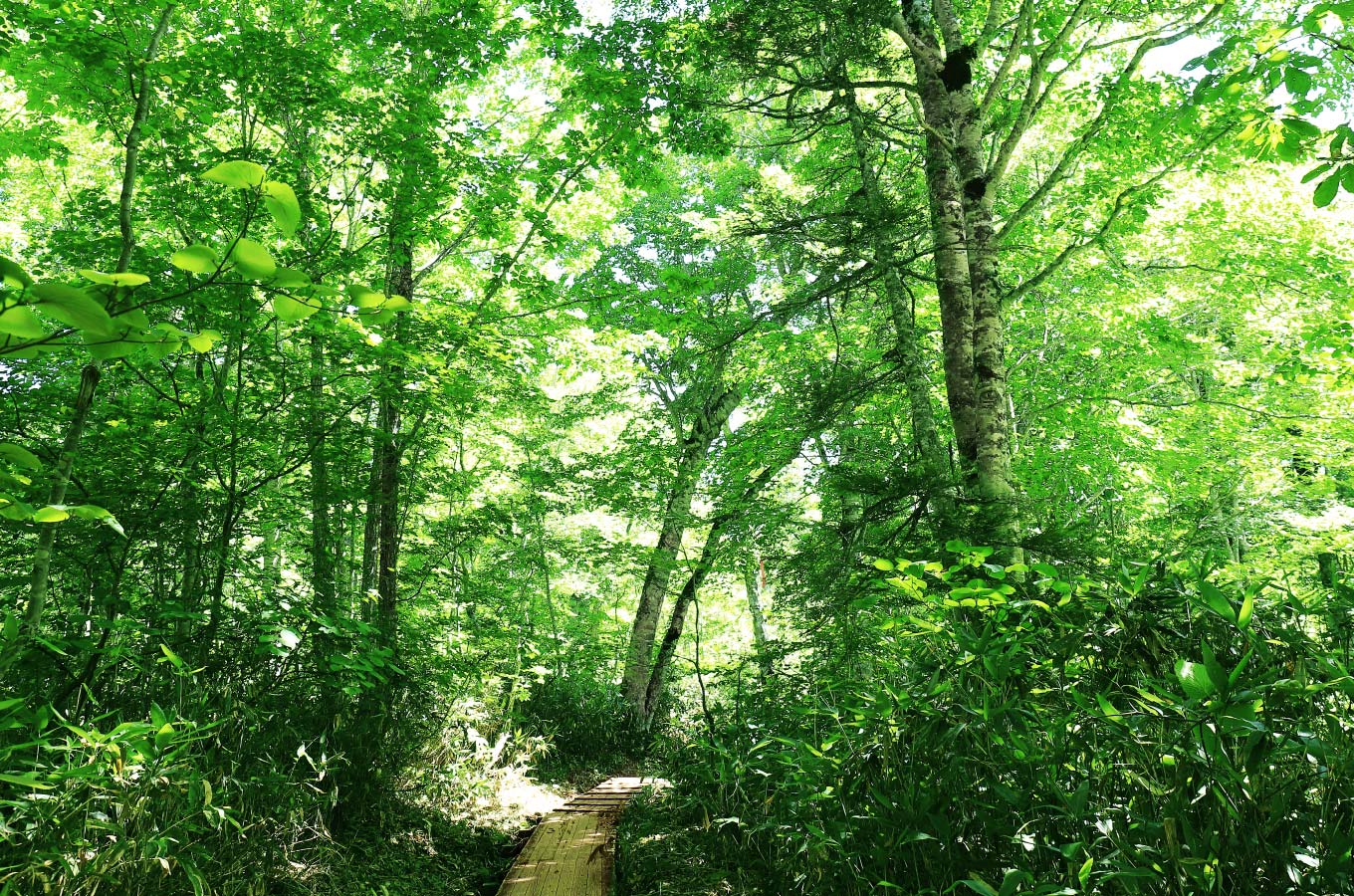 Passing through the deer fence from the Miike parking lot, the route goes counterclockwise around the north side of Mt. Hiuchi, repeating between the forest zone and the large and small Tashiro marshes for some time. Although there are some hilly terrains, there are many gentle wooden paths, and the varying scenery of the Urahiuchi-bashi suspension bridge and small streams will give visitors a taste of trekking.